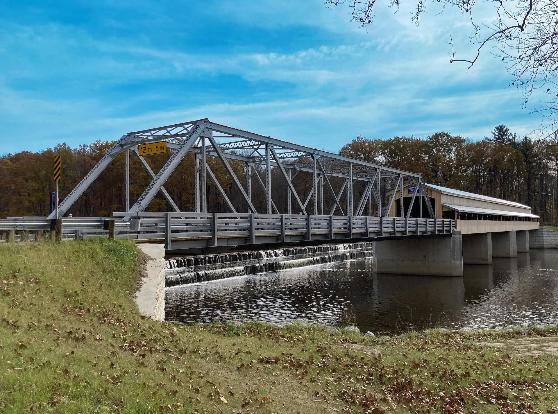 A Warren Truss girder bridge that is formed by a top chord with a polygonal (camelback) shaped geometry. It is an efficient use of steel is a classic choice for rural or industrial settings.